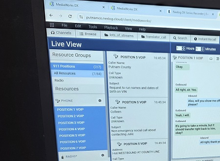 The multi-blue screen photo at the left represents a tiny corner of Eventide's new Critical Insights AI product which by the time you read this will have saved some or even many lives. New software was introduced at IWCE and the screen at left was a tiny portion of the comprehensive display of information with which a call-taker would work..