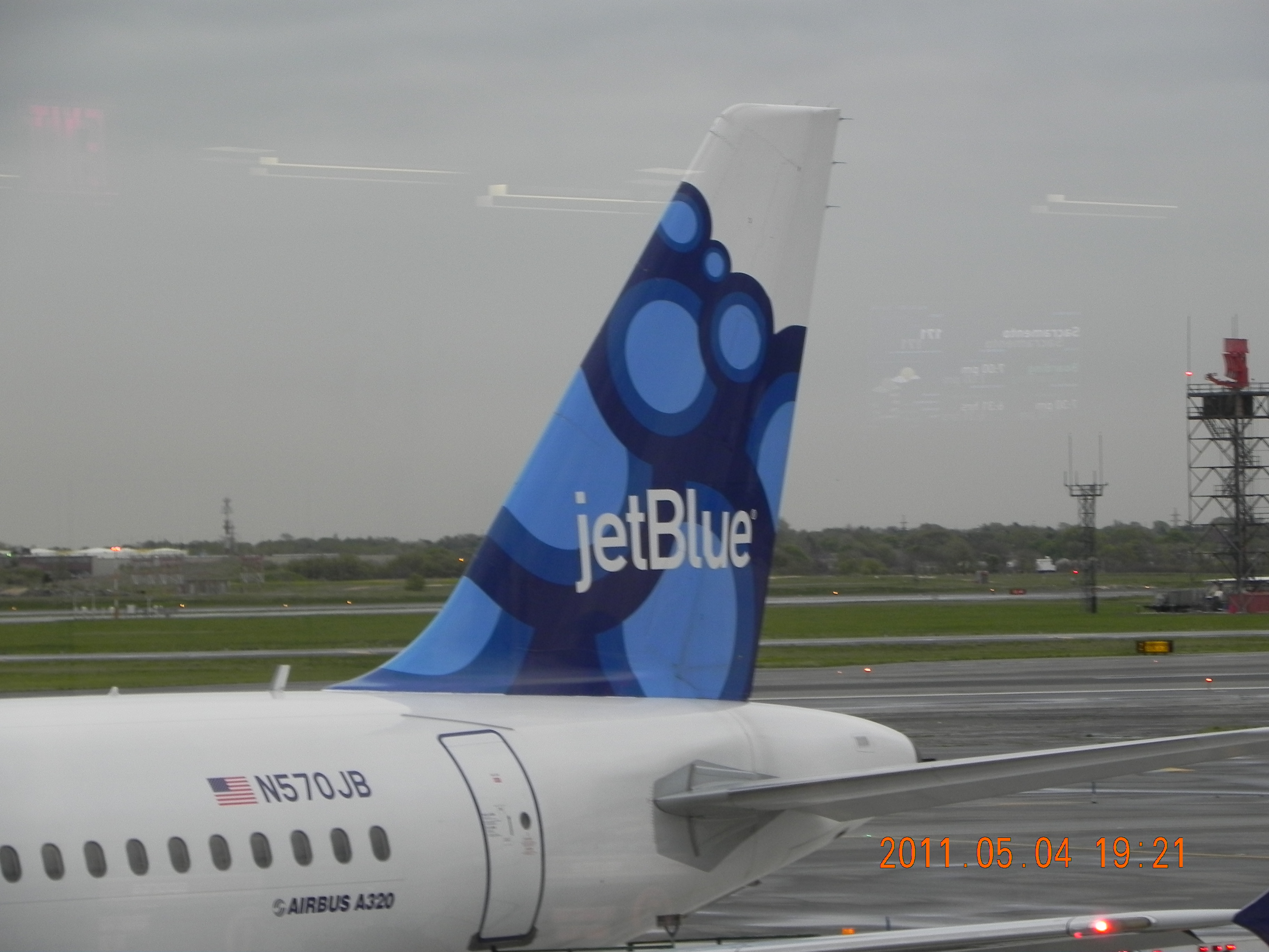 Due to surprisingly light ground traffic, I arrived at the airport earlier than expected and took a seat facing the tarmac window. A minute of observation at the Jet Blue terminal revealed that the vertical stabilizers of their aircraft were all painted fancifully and (most) differently. How many could I spot before my flight?
