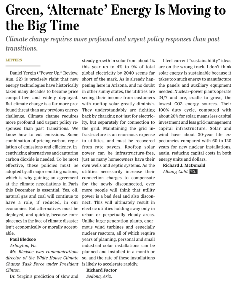 The letter by Richard McDonald is also interesting. I'm very fond of nuclei but I disagree with McDonald on a number of issues, in particular the "non-sustainability" theory he espouses with regard to solar. Perhaps, now that we're letter-column buddies, we can have a debate. I'll let you know when we've booked the auditorium.