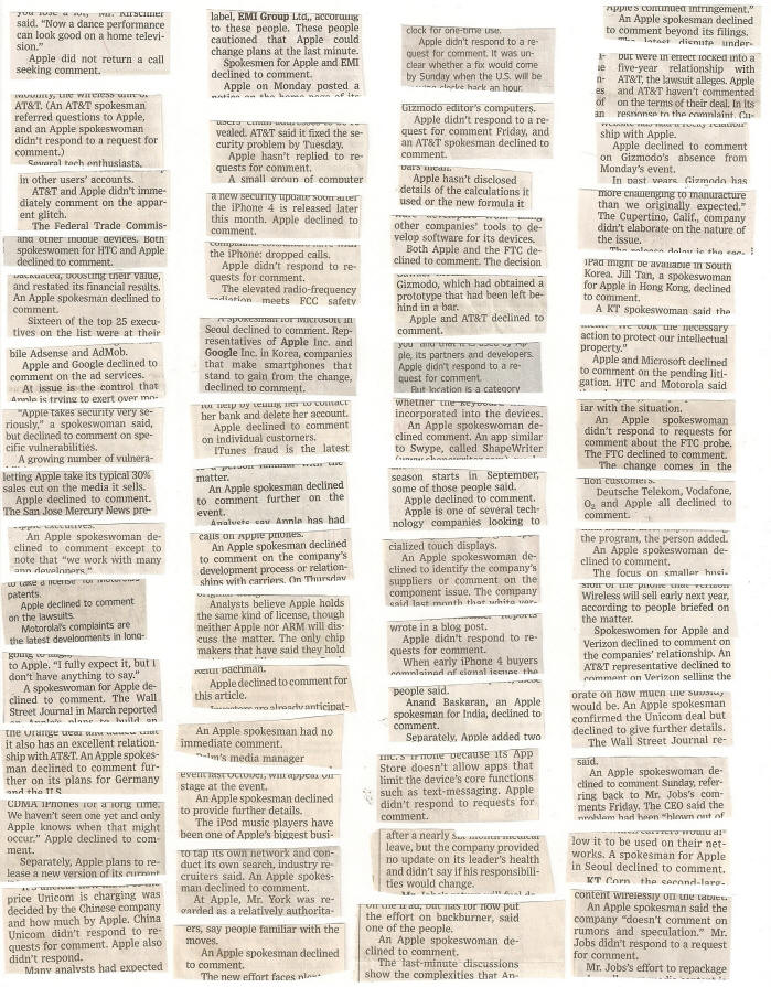 but it's just not the same. There's something more convincing, more permanent about a clipped piece of paper than a digital photograph of an iPad screen. And the clippings are easier to aggregate, too. Yes, I can do the photos without a glue stick, but I think the Declined to Comment Saga has come to an end.