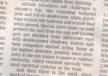 So much for CNN. Fortunately we have the stately Wall Street Journal (05 July 2006, page A17), whose journalists and editors meet a much higher standard, and produce far better researched items, such as this excerpt about the new Chinese train that travels at high altitude to Tibet.