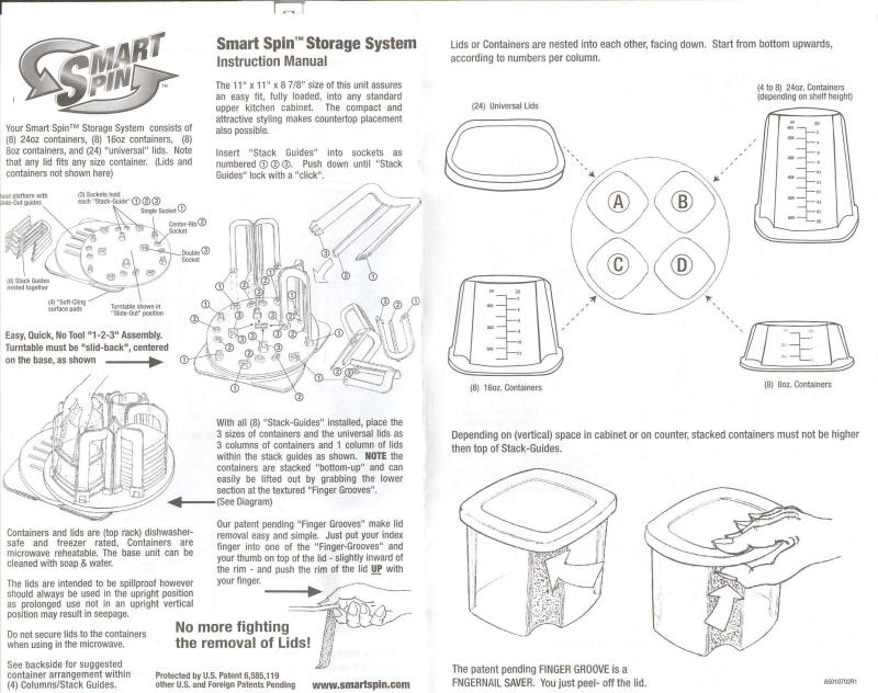 Is this your problem, too? It's time to go to work, and you want to enPLUCOfy your selection of victuals for later consumption. But, when you open the cabinet, your tops and bottoms are in disarray. At best, they will be almost like the photo: Components nicely separated and stacked. At worst, you'll have a Fibber McGee and Molly event, with PLUCO sections all over the floor, and you left to re-sort and re-store them before you can mate a top to a bottom and thus accomplish your mission. In a sense, this problem and photo is a consequence of my frugality. My housemate shops, and occasionally brings home new PLUCOs at, of course ruinous cost. I don't shop, and refuse to discard any takeout container that shows any resilience or sturdiness with respect to multiple closings. Eventually, the PLUCO cabinet contains a mixture of new, used, and improvised containers. Needless to say, compatibility between tops and bottoms is the first desideratum to suffer. Is there a solution to this problem? Of course there is, and my housemate discovered it on one of her pilgrimages to the store. The Federal PLUCO Standardization ActNo, that wasn't it. As nice as it would be for the government to intervene to guarantee that all takeout containers would be exactly the same with interoperable lids, and for the Federal Takeout Coordination Bureau to work with each state's Plastic Goods Authority to assure that separately purchased containers met the standard as well, I don't expect this to occur. There simply is no budget for this, and there won't be until the Federal Spinach Inspectors Union merges with the International Union of Peanut Butter Scrutinizers, which will free government personnel to work on the PLUCO problem. Private industry to the rescue! This is what she did discover. The Smart Spin PLUCOmatic